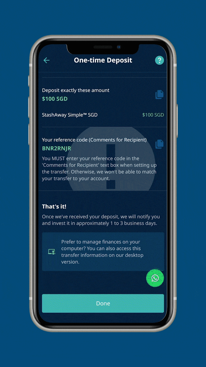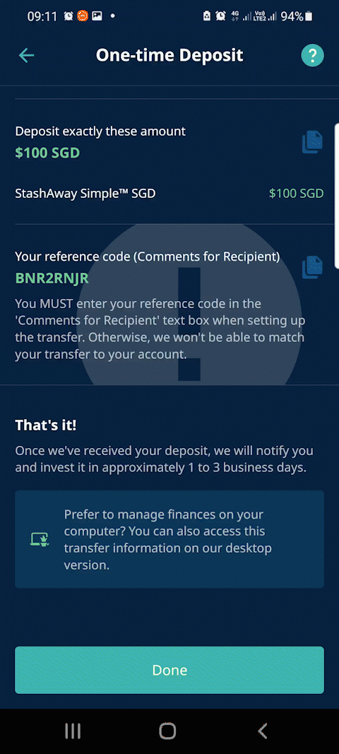 The lack of apparent and clear feedback for major actions done on the apps. For example, depositing sums of money to StashAway, setting up a recurring payment or referring a friend.